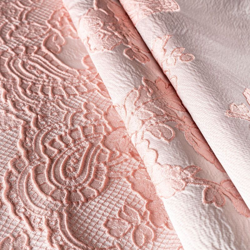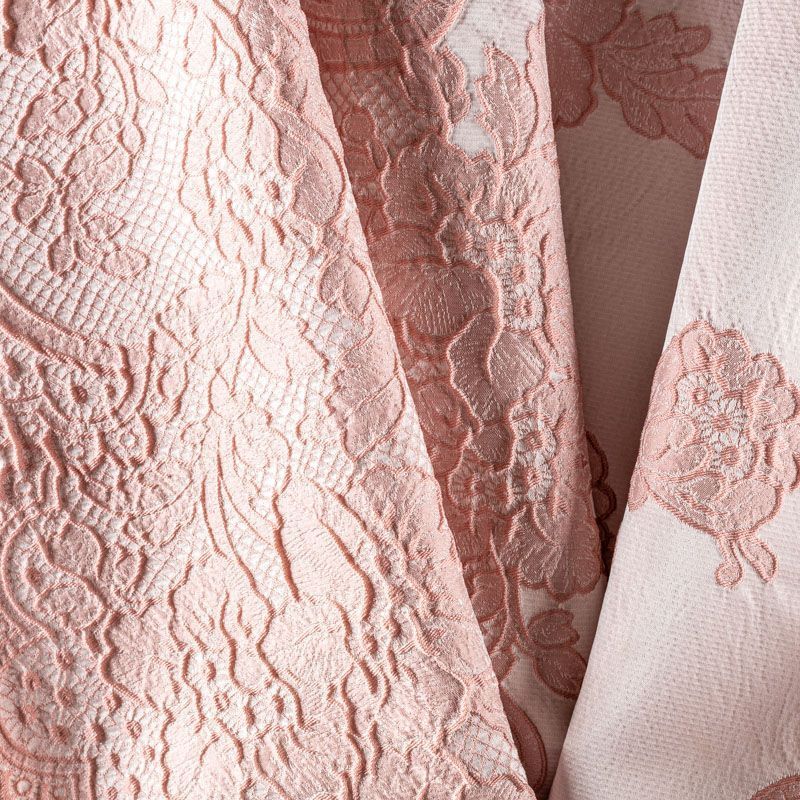 Итальянский атласный жаккард с нежным дизайном пейсли и цветов в розовых оттенках. Ткань легкая, поверхность фактурная со сдержанным блеском, хорошо драпируется, не тянется и не просвечивает. Рисунок сосредоточен вдоль кромки, поэтому жаккард на изделие набирается объемом. Подойдет для пошива нарядных вечерних костюмов, платьев-футляров или стиле Dior, жакетов, топов, летних пальто, бомберов, юбок или шорт.