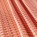 Мягкий жаккард в ярком коралловом оттенке с мелким абстрактным узором желтого цвета. Ткань пластичная, непрозрачная, поверхность фактурная в рубчик, приятная на ощупь, тянется, немного держит форму, хорошо драпируется красивыми складками. Будет комфортна для пошива костюма, женственного платья, юбки, брюк, легкого пальто, мягкого бомбера.