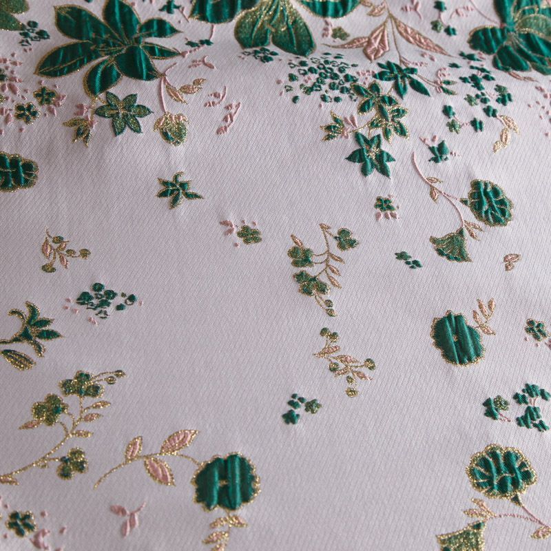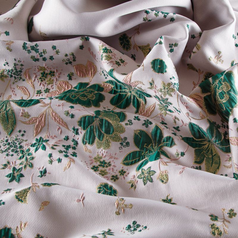 Итальянский жаккард в нежно-розовом оттенке с контрастным цветочным дизайном. Ткань легкая, но плотная, поверхность матовая, фактурная, хорошо драпируется и держит форму, не тянется и не просвечивает. Подойдет для пошива нарядных вечерних костюмов, платьев-футляров в стиле Dior, жакетов, топов, летних пальто, бомберов, юбок или шорт.